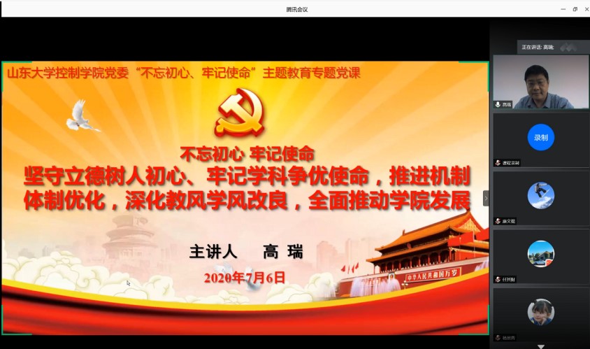 为庆祝中国共产党成立99周年,贯彻落实教育部党组《关于在教育部直属高校和部省合建高校各级党组织开展“四个一”行动方案》和山东省委教育工委《关于开展“我来讲党课”活动的通知》精神,近日,澳门十大信誉网赌大全党委书记高瑞给学院全体研究生党员讲授了“不忘初心、牢记使命”主题教育专题党课,授课以线上线下结合的方式进行。
