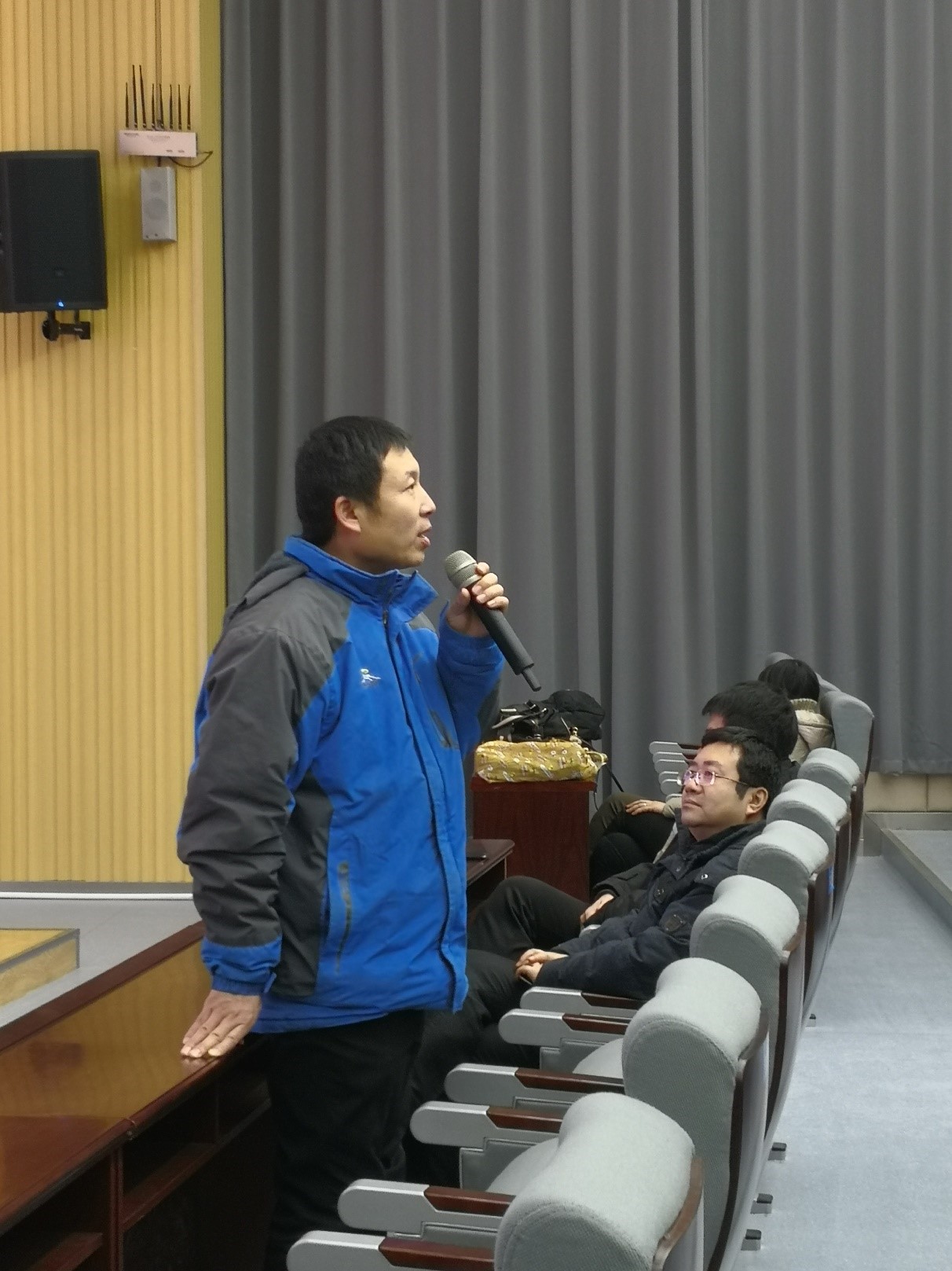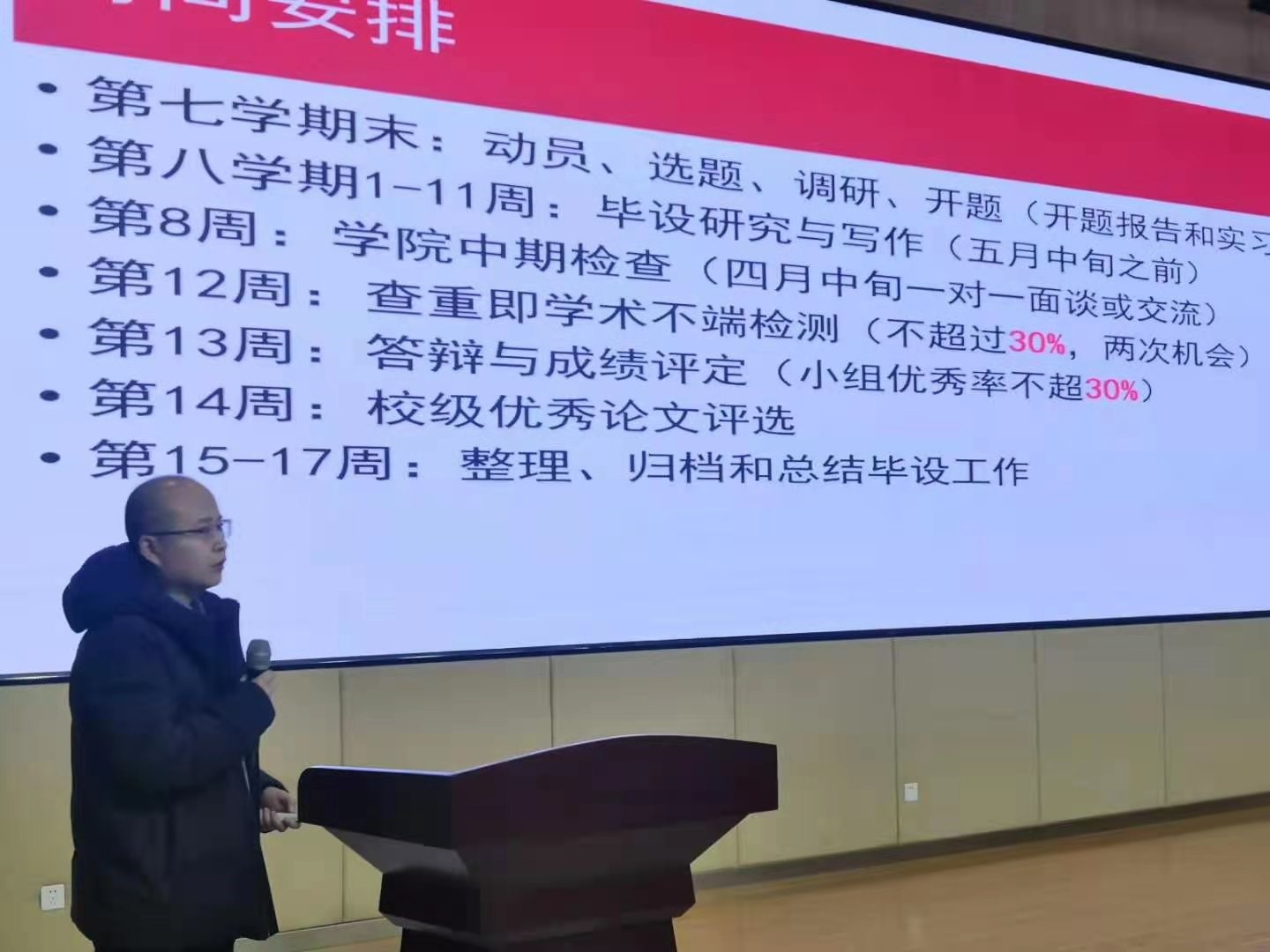 吴皓主任围绕如何做好毕设,给同学们提出了三点要求:第一思想上要重视,强调了毕业设计环节在大学四年中的重要性;第二要付诸行动,不能懒,光想不做毕设质量不能保证;第三要合理安排时间,把考研复试、找工作等事情与毕设关系处理好。刘国良副主任分别从毕业论文时间点安排、双向选题方式方法、论文撰写与大小组答辩、考勤纪律等方面介绍了毕业论文(设计)过程中应注意的事项,重点说明毕设与普通课程不同,是问题导向。同学们要发挥主观能动性,积极调研相关的前沿文献资料,了解别人如何解决的,自己又如何在别人基础上提高和创新。陈桂友副主任呼吁同学们围绕毕设过程中的问题,积极主动与导师联系,保持沟通,加强感情培养。