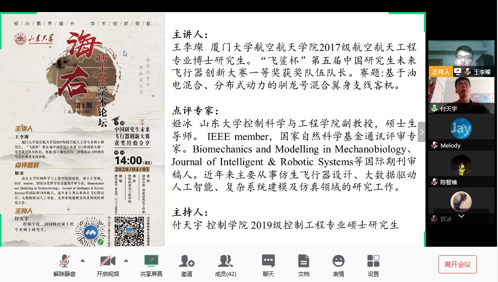 2020年4月3日下午14点00分,由澳门信誉最好十大平台研究生院、党委研究生工作部主办的研究生特色学术活动品牌,澳门十大信誉网赌大全承办的第1期(总693期)“海右”博士生学术论坛腾讯会议如期举办,此次论坛邀请了厦门大学航空航天学院2017级航空航天工程专业博士研究生王李璨作报告,澳门十大信誉网赌大全姬冰副教授作为点评嘉宾出席了本次论坛。
