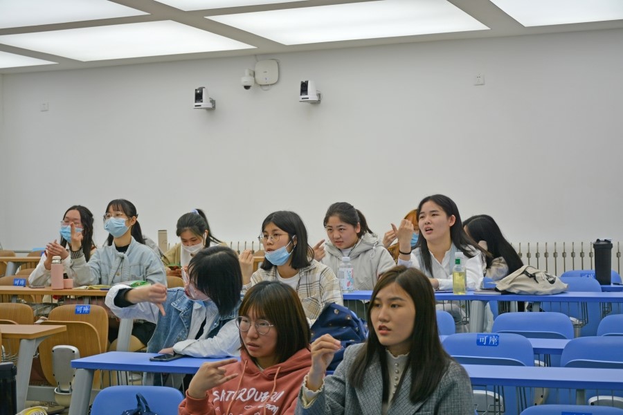 下午2时,培训正式开始。杨海宁简单阐述了当今时代聋哑人所面临的诸多困难,表示希望同学们能够展现青年大学生健康向上的精神风貌,沟通无声世界、关爱弱势群体,宣传手语志愿服务理念。紧接着,杨海宁向同学们介绍手语的基本知识,帮助大家了解手语学习方法和如何用手语进行表达。现场气氛轻松活跃,老师和同学们积极互动,使得手语学习更加有趣高效,在分享中感受快乐,于手语中认识美、提升美、创造美。培训临近尾声,杨海宁指导同学们将这次培训所学的知识运用到手势舞的编排中,在动人的《萱草花》歌声中,同学们指尖纷飞,演绎出了一场精彩而优美的手势舞。本次手语培训的成功举办,加深了同学们的手语知识,切实感受手语的巨大魅力,用指尖诉说感动与关爱。至此,本次手语培训圆满结束。