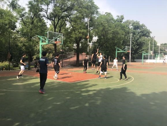 青春是昂扬向上的,青春是活力四射的。对战双方分别是研一新生队和研二、研三及博士生联队,比赛分为上下两场进行。随着裁判的一声哨响,整个球场立刻充满了紧张活泼的气氛,各位球员全力以赴,积极防守、进攻,越战越勇,青年人的汗水和激情淋漓尽致地挥洒在球场上。队员之间配合默契,双方拼抢激烈,带球、运球、投篮一系列动作连贯潇洒,引来围观同学阵阵喝彩。