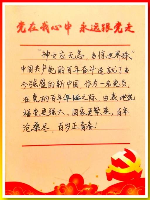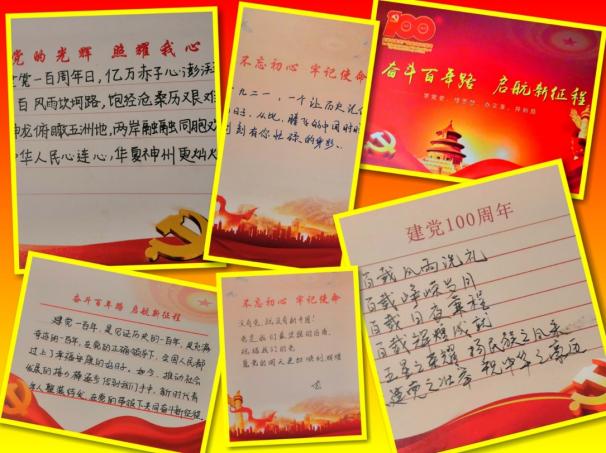 1921年到2021年,改变的是数字,是时间,不变的是青年学生党员和入党积极分子对党的初心和忠诚。党支部书记晏家梁在贺卡上郑重地写下,坚定不移听党话,至死不渝跟党走,对党忠诚,永远是身为共产党员始终如一的誓言。入党积极分子赵芮表示,生在红旗下,长在春风中,坚定拥护党的领导,积极向党组织靠拢,是身为入党积极分子最纯粹的决心。七月红旗飘飘,借五星之荣耀,庆建党之壮举,作为新时代青年的我们,继续传承红色基因,赓续精神血脉,保持青春活力,不断创新追求,用实际行动为我们党100周年献礼。由衷地祝福伟大的中国共产党更加强大、国家更加繁荣、人民更加幸福。