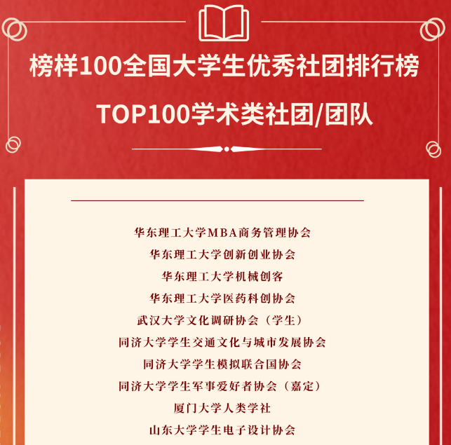 “榜样100”全国优秀大学生社团榜单由中国大学生社会实践知行促进计划(简称“知行计划”)、青年影响力创新中心联合发布,旨在鼓励和表彰始终活跃在乡村振兴、助学支教、环境保护、专业赛事、创新创业等各式青年行动一线的高校大学生社团、团队。本届榜样100开放四大赛道,表彰在环境类、教育类、学术类及文体类表现突出的社团团队。