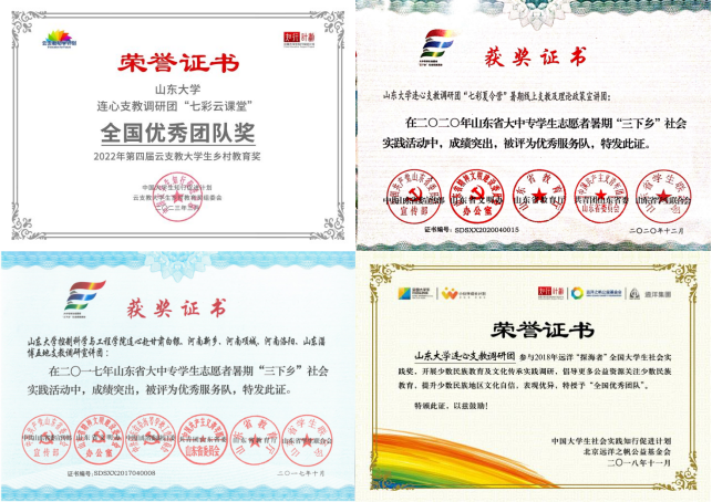 澳门信誉最好十大平台学生连心支教调研团连续多年被评为澳门信誉最好十大平台优秀社会实践团队、山东省优秀社会实践团队,获评2019年“榜样100”全国最佳大学生社团,曾获2022年第四届大学生云支教乡村教育奖、阿克苏诺贝尔全国大学生社会公益奖、全国远洋之帆大学生社会实践奖等。