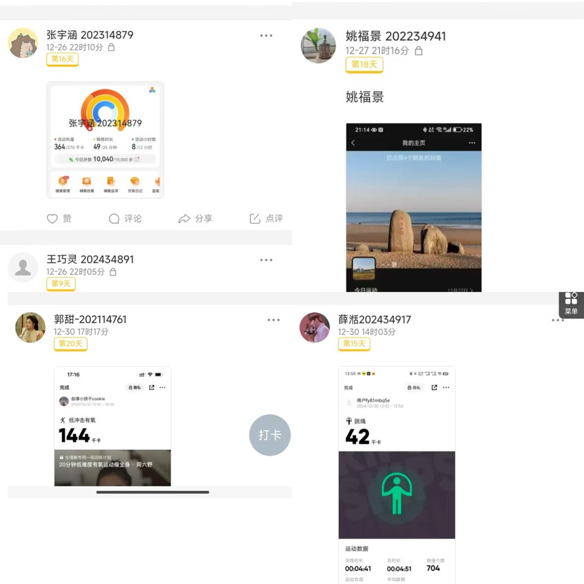 本次活动采取“线下锻炼+线上打卡”的形式,同学们可自由选择跑步、跳绳、仰卧起坐、骑行等多种方式来完成每日运动任务,并通过微信小程序上传运动记录。为保证结果透明公正,研会工作人员每天统计打卡情况,并于次日公布打卡结果。活动上线后,控院学子踊跃参与,活动期间,共有64名同学参与其中,累计完成打卡910次。