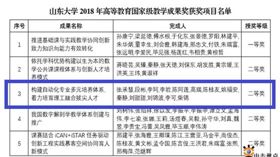 2018年,学校站在“双一流”建设的高度,深入贯彻落实“成都会议”精神,牢牢抓住培养社会主义建设者和接班人的根本任务,坚持以本为本,推进“四个回归”,全力打造一流本科教育,取得突出成绩。山大63位专家入选新一届教育部高校教指委员会,入选数量居全国高校第7位(控院占其2)。山大学子在各项赛事中频获佳绩,共获国际竞赛一等奖50项,国家级奖143项,省级439项。学校强化多学科交叉融合培养,申请增设人工智能等6个新工科专业,开设全球能源互联网等16个新工科特色实验班。(控院占其2,人工智能与机器人实验班、自动化科学实验班)