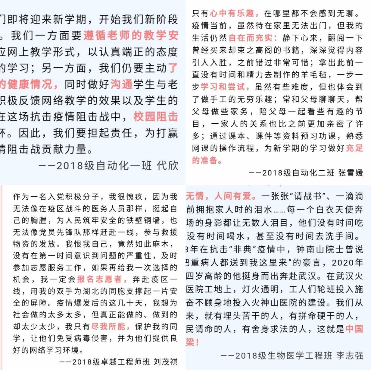 这些感人事迹无不体现出学生党员和共青团员的责任担当和主动作为,体现出青年大学生听从党和国家号召,一起齐心协力,共克时艰的决心和勇气。