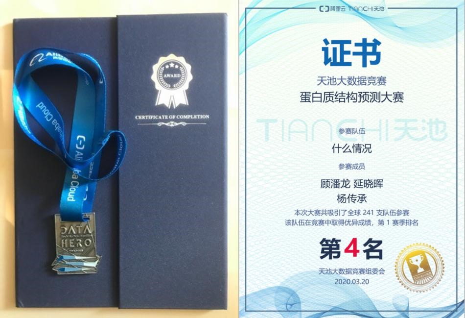 此次天池大数据竞赛蛋白质结构预测大赛共有来自全球的241支参赛队伍,由顾潘龙同学、延晓辉同学组成的“什么情况”参赛队伍,在此次竞赛中取得了优异的成绩——第1赛季排名第4,获得了由天池大数据竞赛组委会颁发的获奖证书及奖牌。