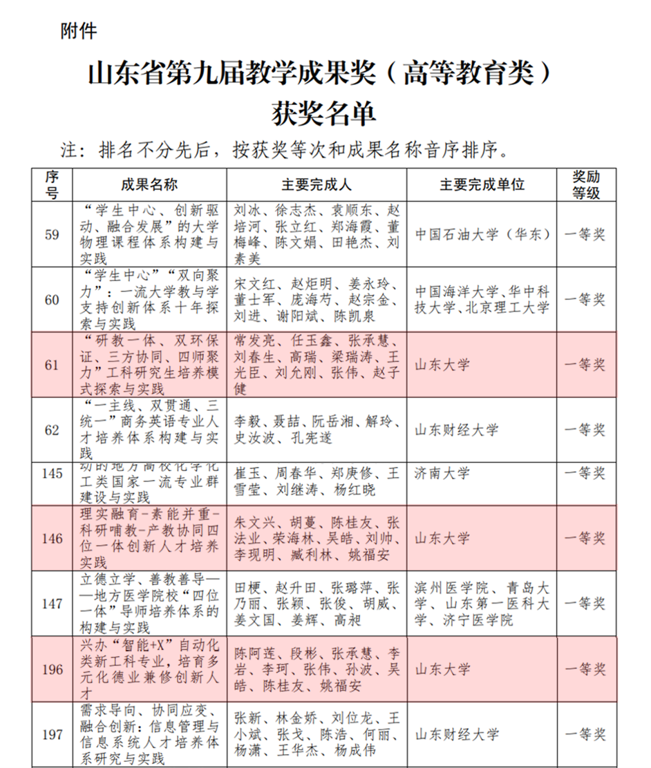 近日,山东省教育厅公布了山东省第九届教学成果奖(高等教育类)获奖名单,十大信誉网赌常发亮教授主持申报的“‘研教一体、双环保证、三方协同、四师聚力’工科研究生培养模式探索与实践”、朱文兴教授主持申报的“理实融育-素能并重-科研哺教-产教协同四位一体创新人才培养实践”、陈阿莲教授主持申报的“兴办‘智能+X’自动化类新工科专业,培育多元化德业兼修创新人才”三项成果同获一等奖,创造了澳门十大信誉网赌大全申报省级教学成果奖以来的最好成绩。