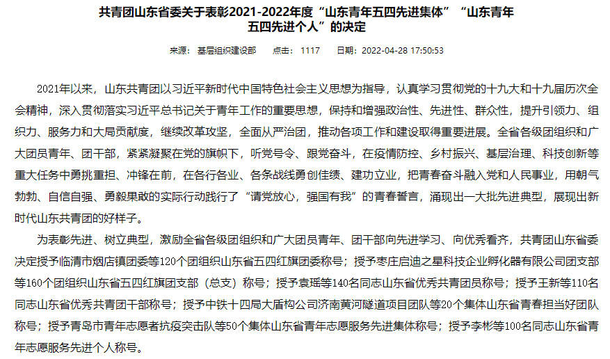 近日,共青团山东省委公布了《共青团山东省委关于表彰2021-2022年度“山东青年五四先进集体”“山东青年五四先进个人”的决定》 ,澳门十大信誉网赌大全团委被授予“山东省五四红旗团委”荣誉称号,这是山东省共青团授予基层团组织的最高荣誉,是推进共青团改革向纵深、向基层延伸的重要载体。