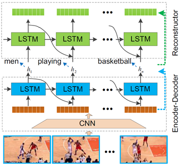 该论文提出了一种新的用于视频描述(video captioning)的编码器-解码器-重构器深度模型,简称RecNet。该模型可以充分挖掘视频内容与文字描述之间的双向信息,所提出的重构器融合策略可以在全局层面和局部层面同时重构视频片段特征,从而首次实现了视频特征和自然语言的双向映射。RecNet模型在多个国际公认的大规模视频语义描述数据集上,都取得了目前最好的测试结果。